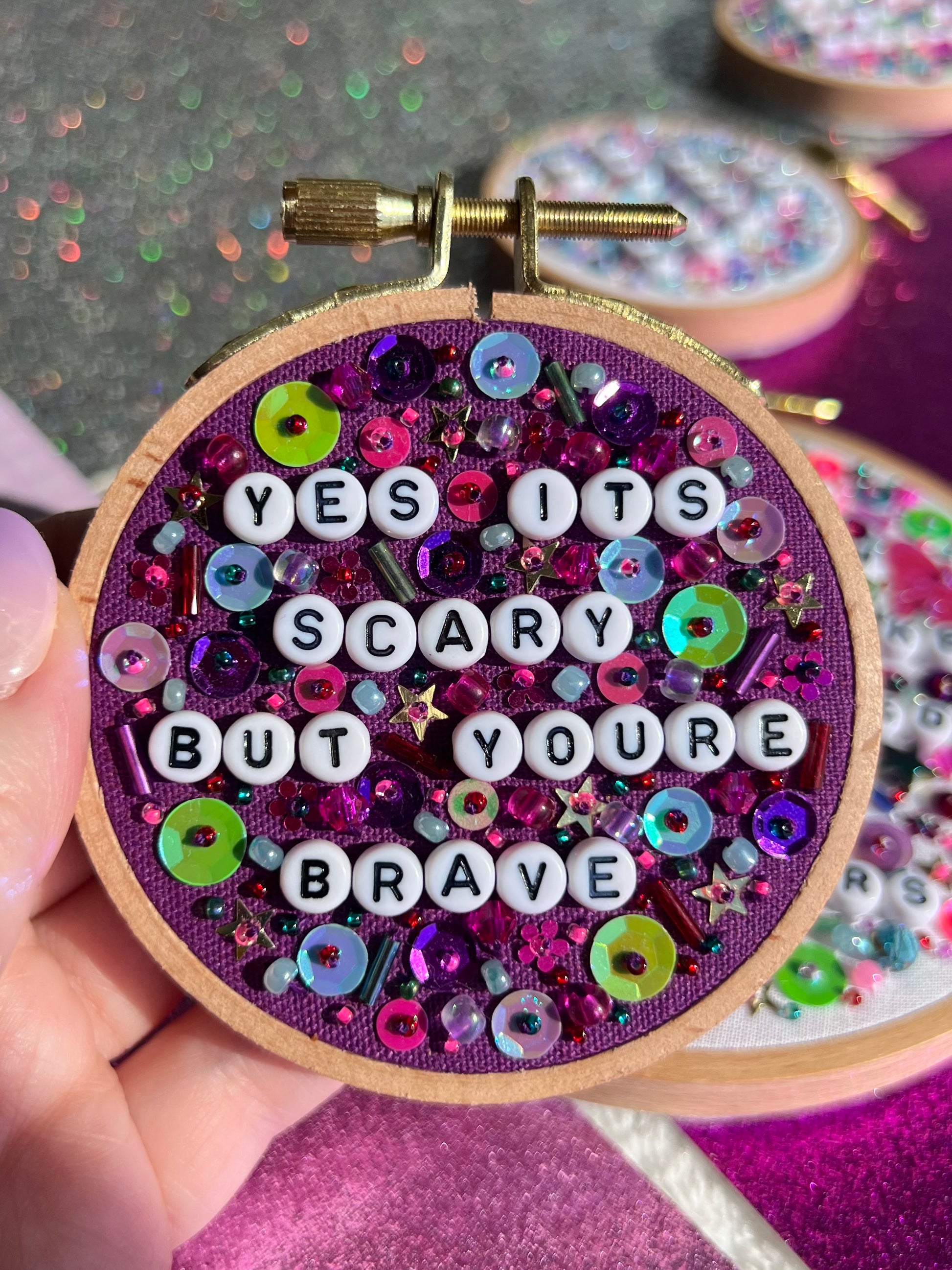 But You're Brave Beaded Hand Embroidered Decor in 3 inch Wooden Hoop